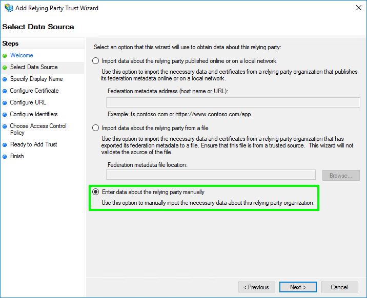 Vælg "Claims aware" i guiden "Add Relying Party Trust Wizard", og klik på "Start". - I "Vælg datakilde" skal du vælge "Indtast data om den afhængige part manuelt".