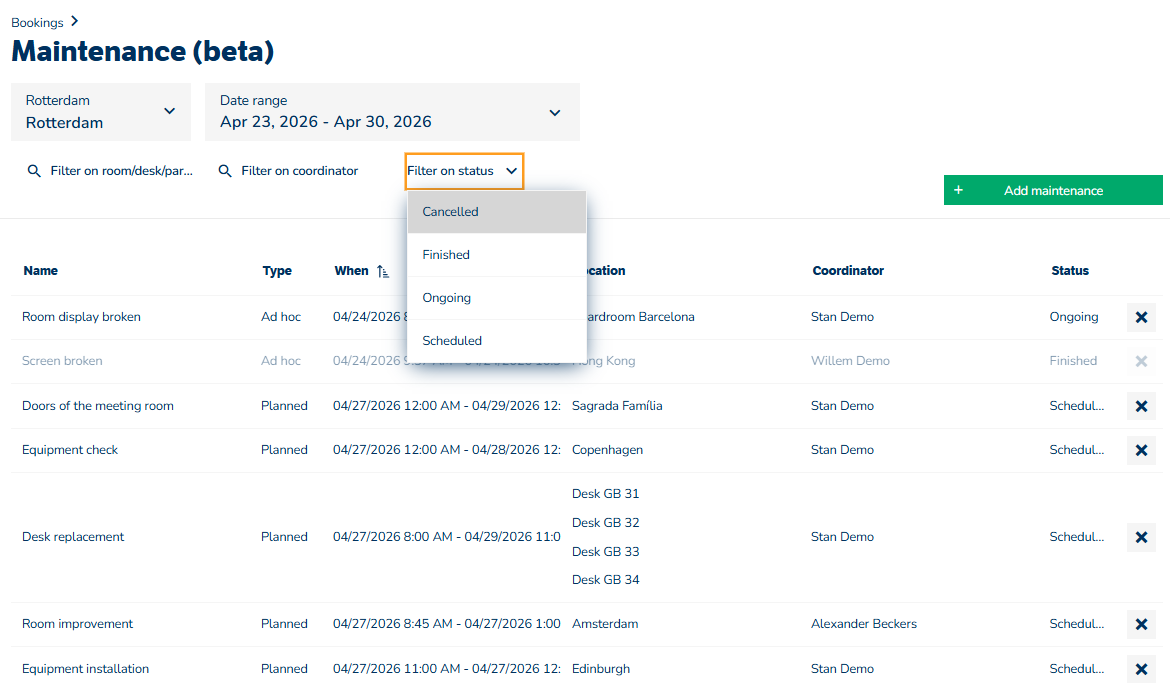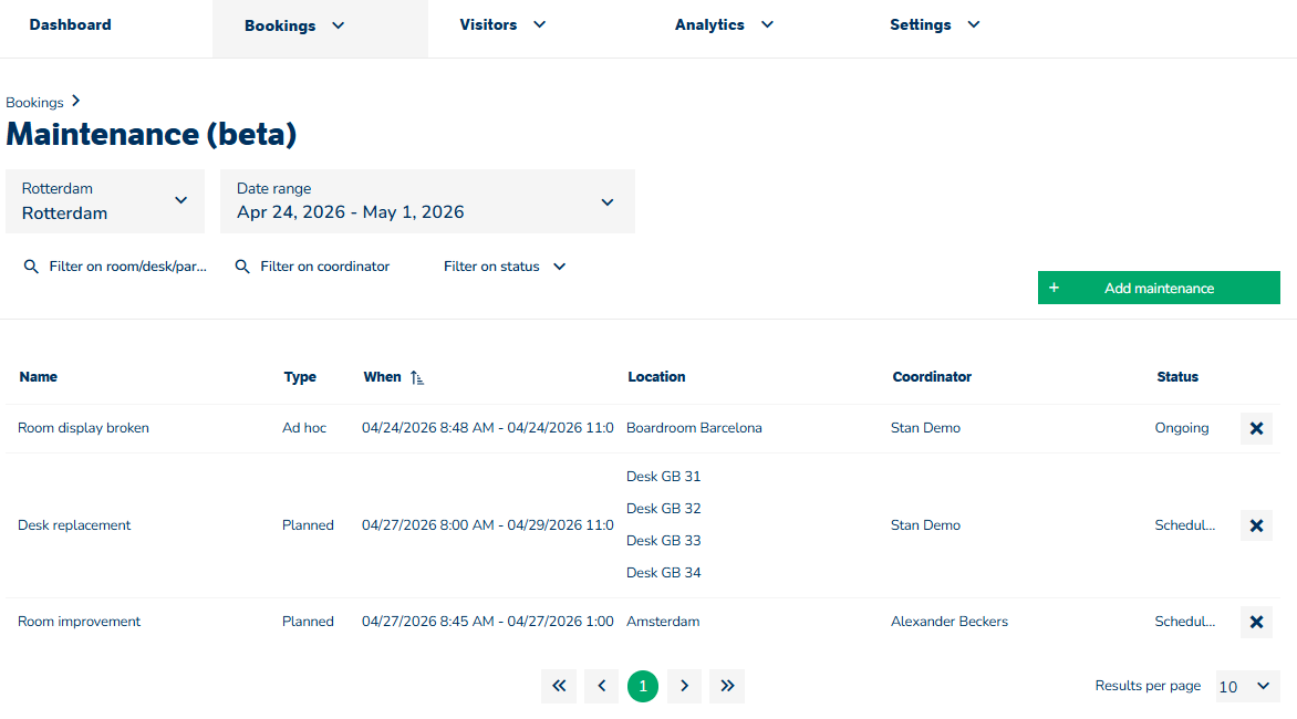 Der er tilføjet en ny side om vedligeholdelse i rullemenuen under »Bookinger«, som giver et overblik over alle kommende vedligeholdelsesopgaver. Vedligeholdelsesansvarlige kan filtrere efter sted, dato, område eller andre kriterier og nemt planlægge nye vedligeholdelsesopgaver.