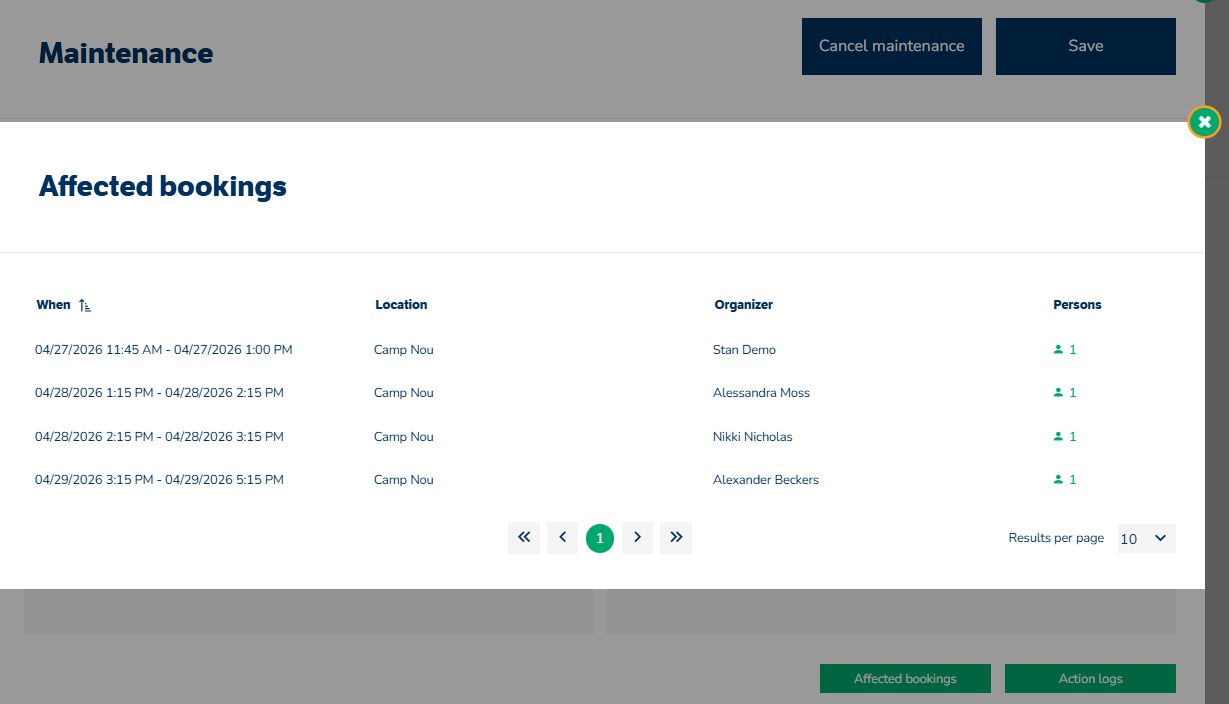 Brug knappen »Berørte bookinger« til at se alle bookinger inden for vedligeholdelsesperioden.