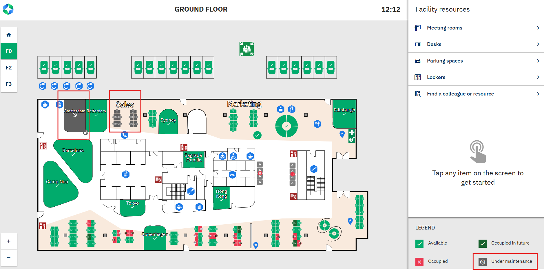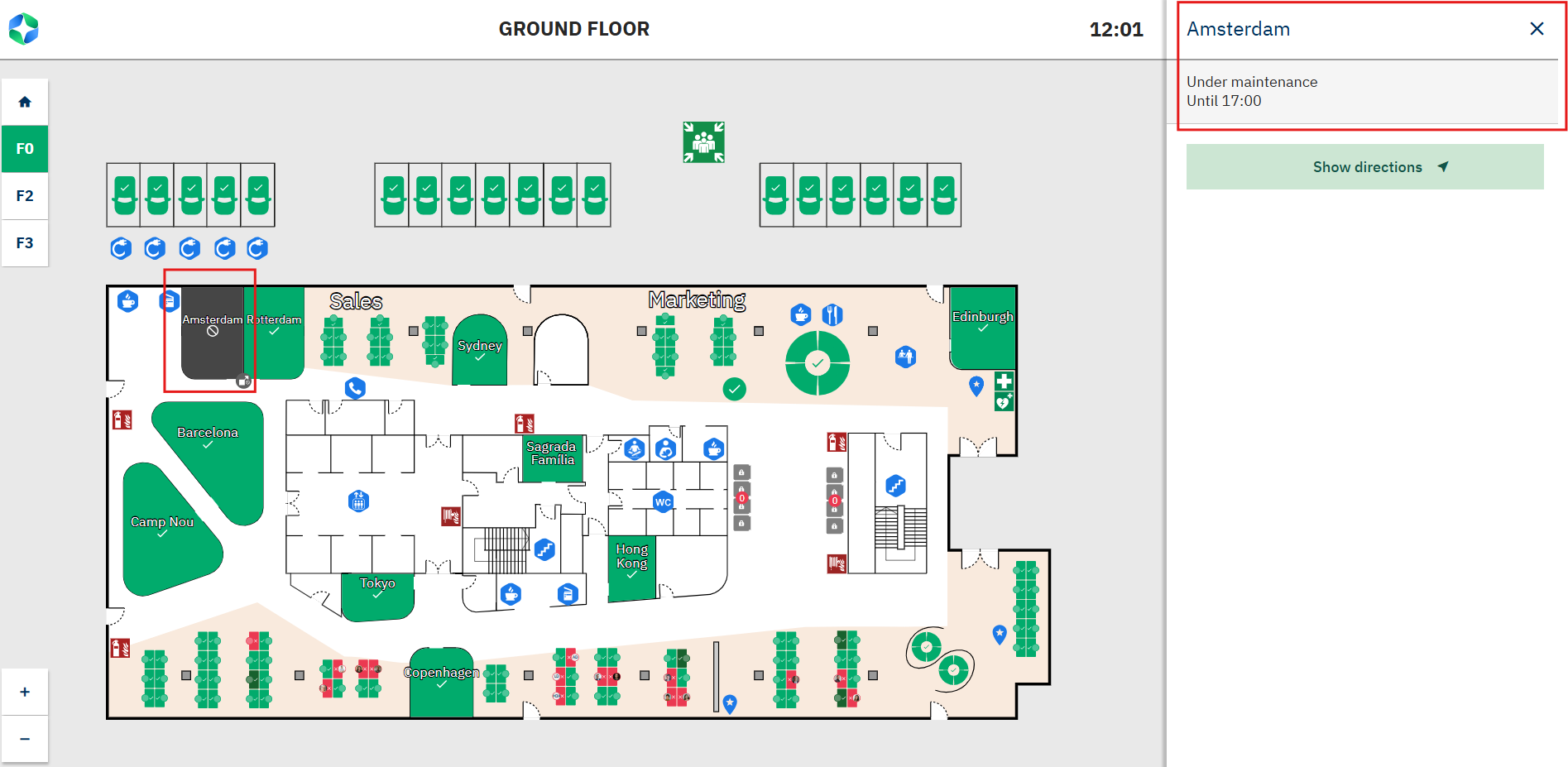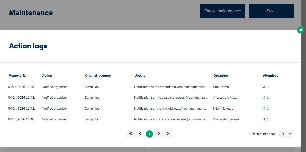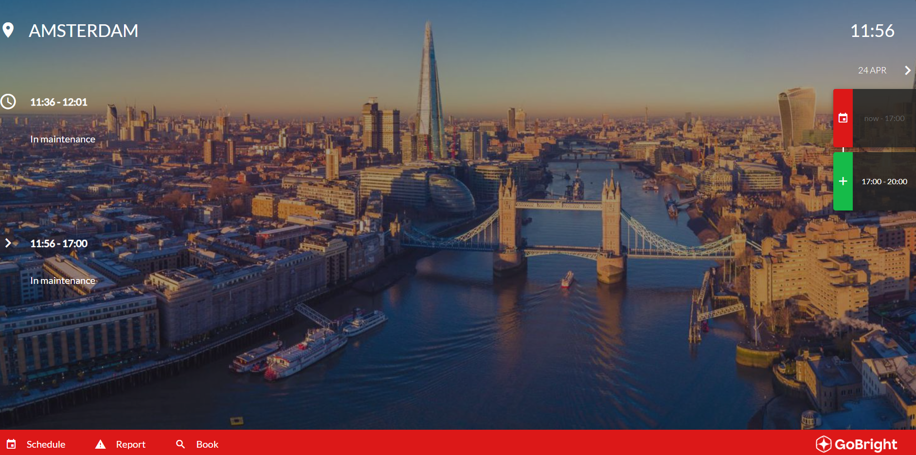 I panelet »Rum« er skærmen markeret med rødt sammen med en vedligeholdelsesmeddelelse. Det næste ledige tidsrum, der vises med grønt, ligger efter vedligeholdelsestidspunktet.