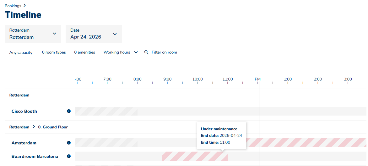 Når et rum er under vedligeholdelse, vises dette også i Tidslinje. Hold musen over rummet for at se flere oplysninger om tidspunktet og datoen for vedligeholdelsen.