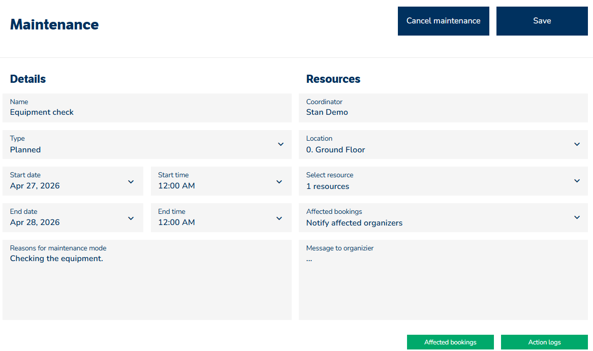 På denne side kan brugerne se og redigere igangværende og kommende vedligeholdelsesopgaver samt se alle bookinger, der er knyttet til de berørte ressourcer i den valgte periode.