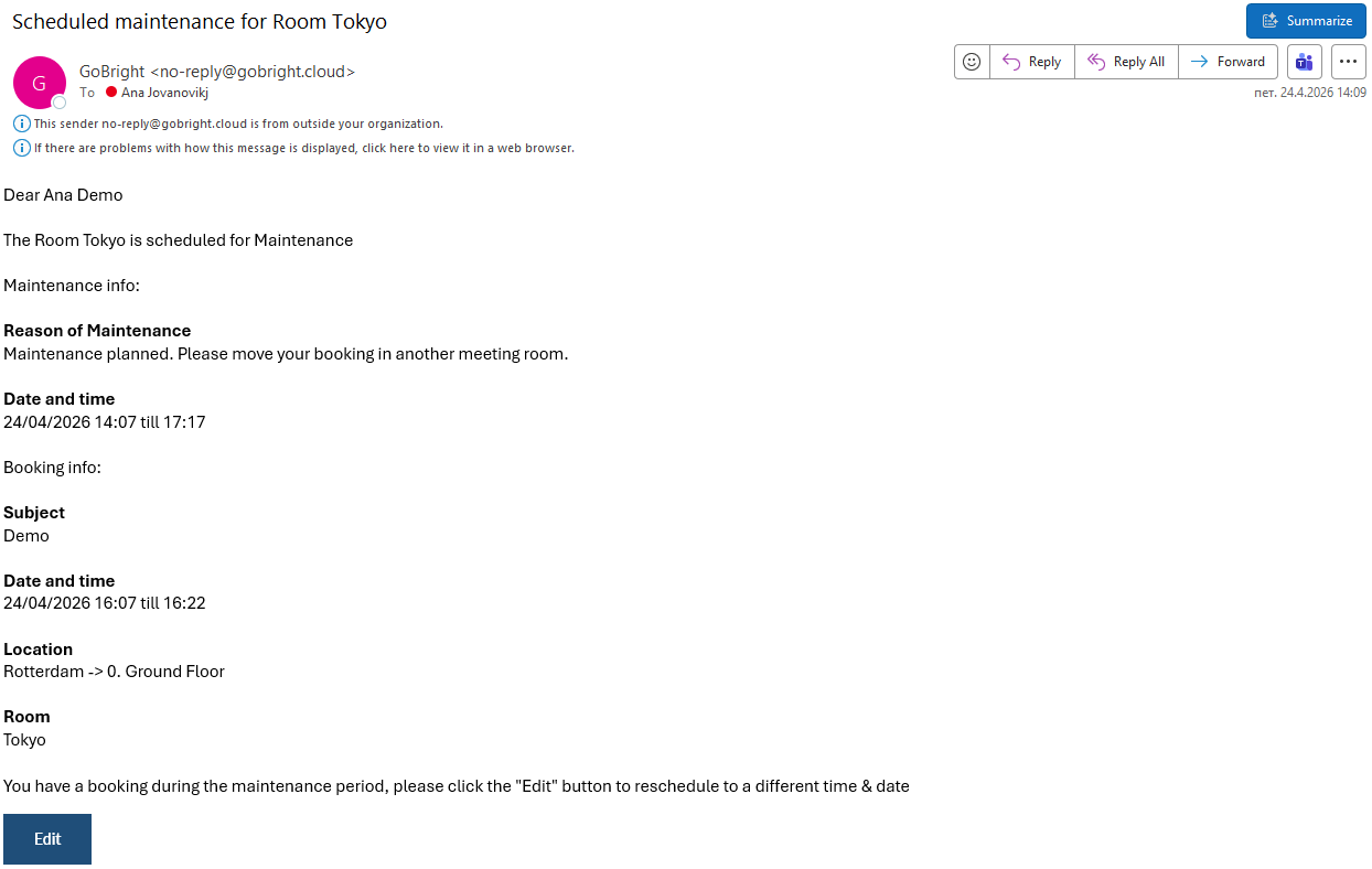 Arrangører af bookinger inden for det berørte tidsrum modtager en e-mail-besked med oplysninger om årsagen til vedligeholdelsen samt bookingoplysningerne (dato, klokkeslæt, emne, ressource). E-mailen indeholder også en knap med teksten »Rediger«, der fører direkte til bookingen i GoBright.