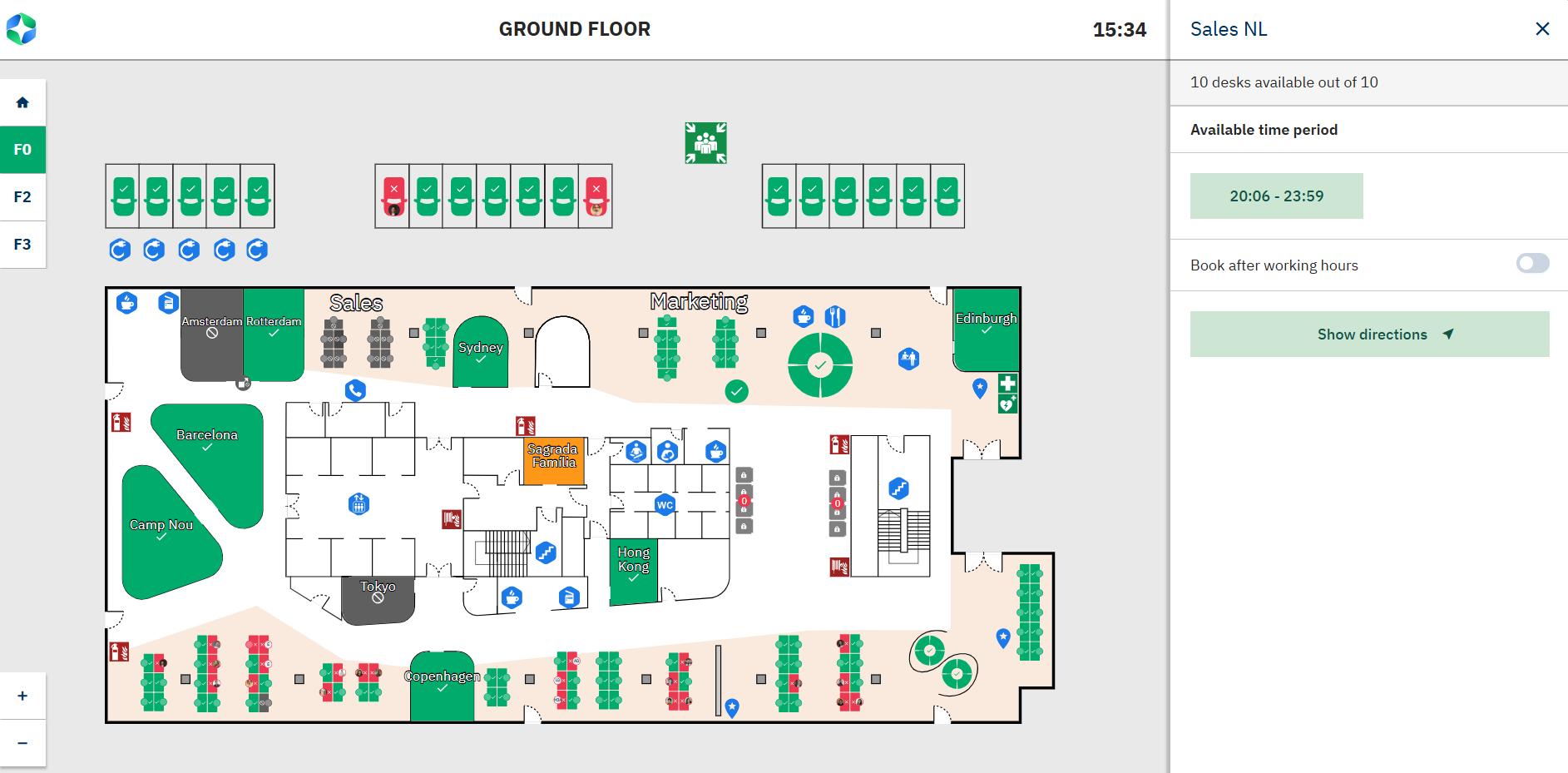 Skrivebordsområdet vises også i kortviseren sammen med det næste ledige tidsinterval: