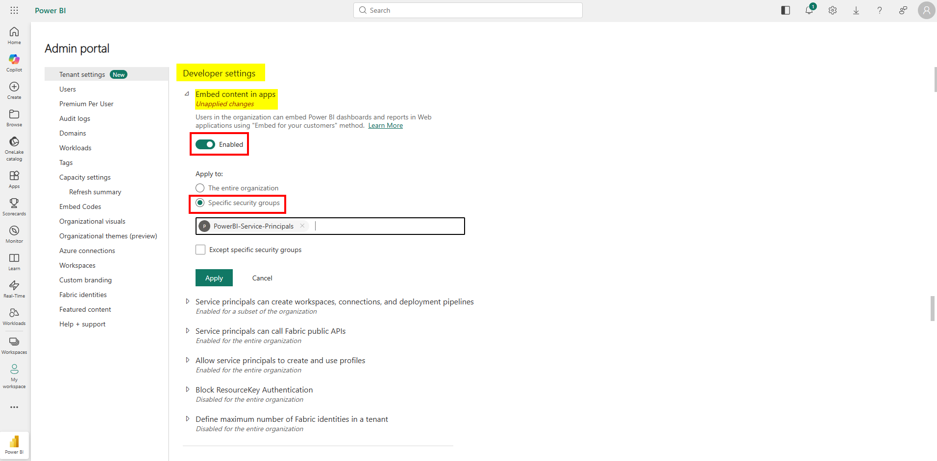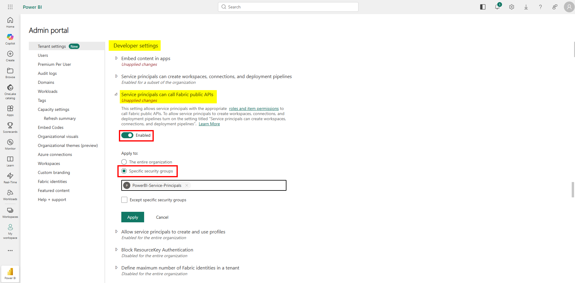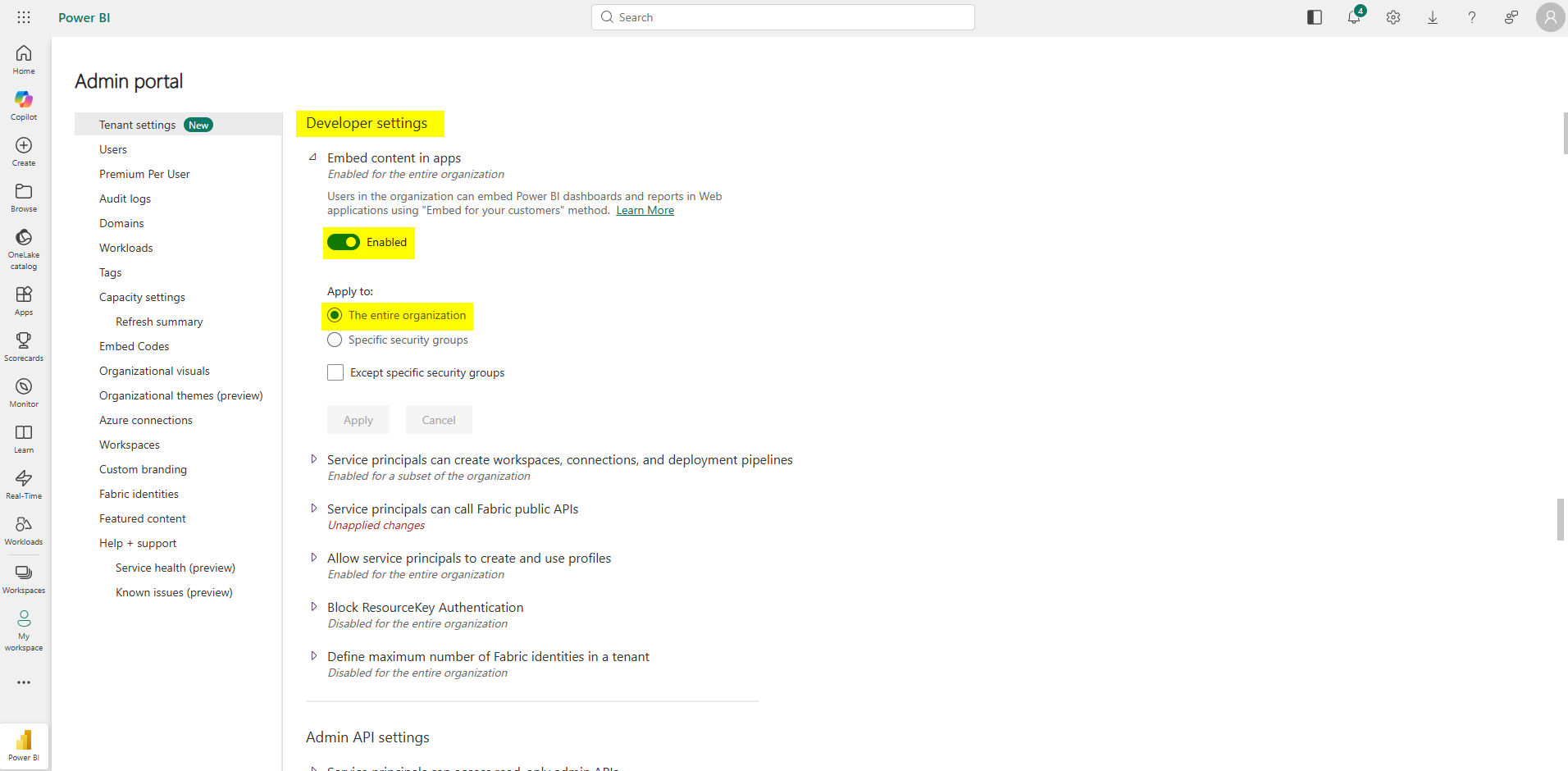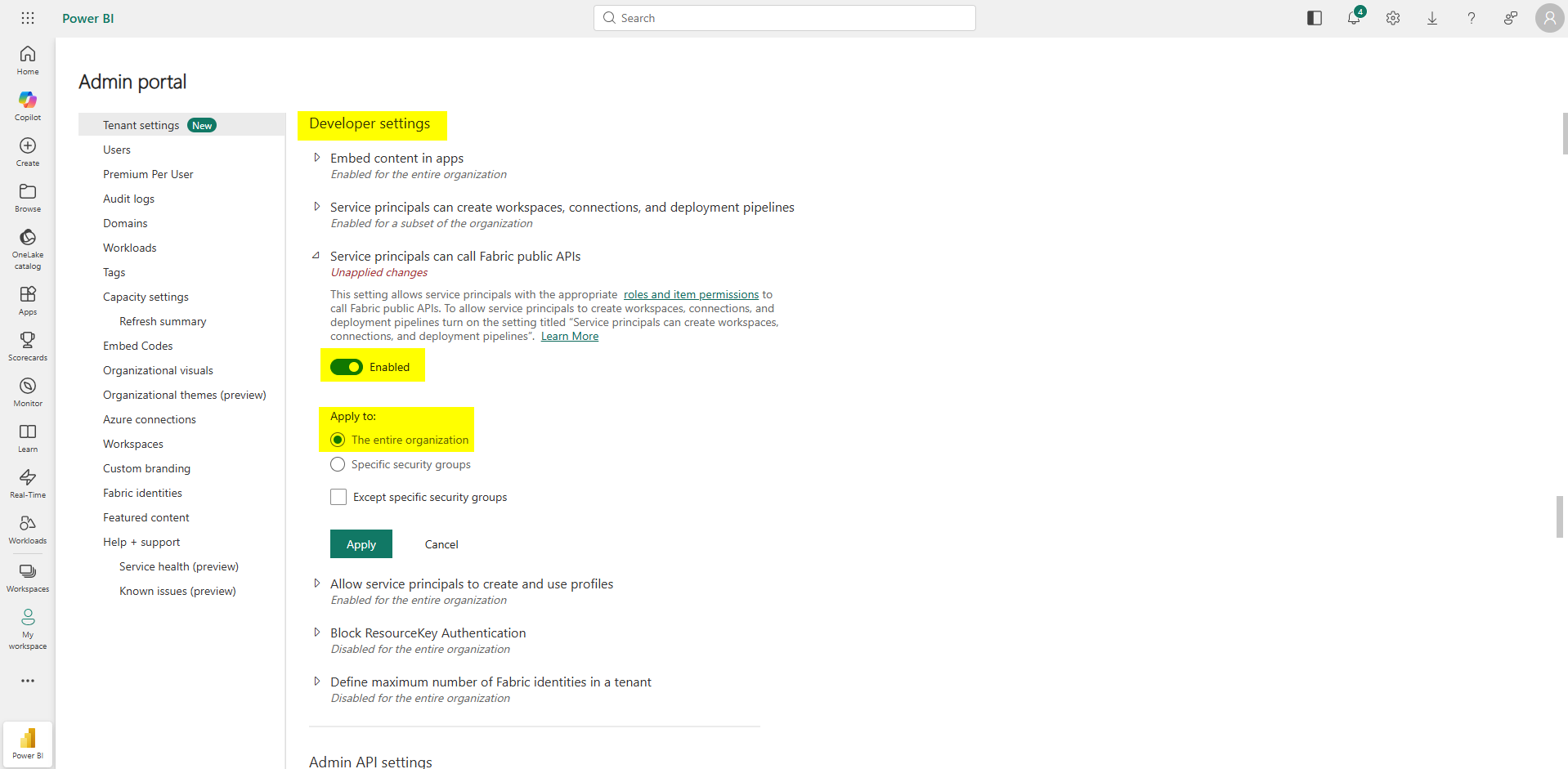 - ✅ Aktiveret: Serviceprincipaler kan kalde Fabric's offentlige API'er