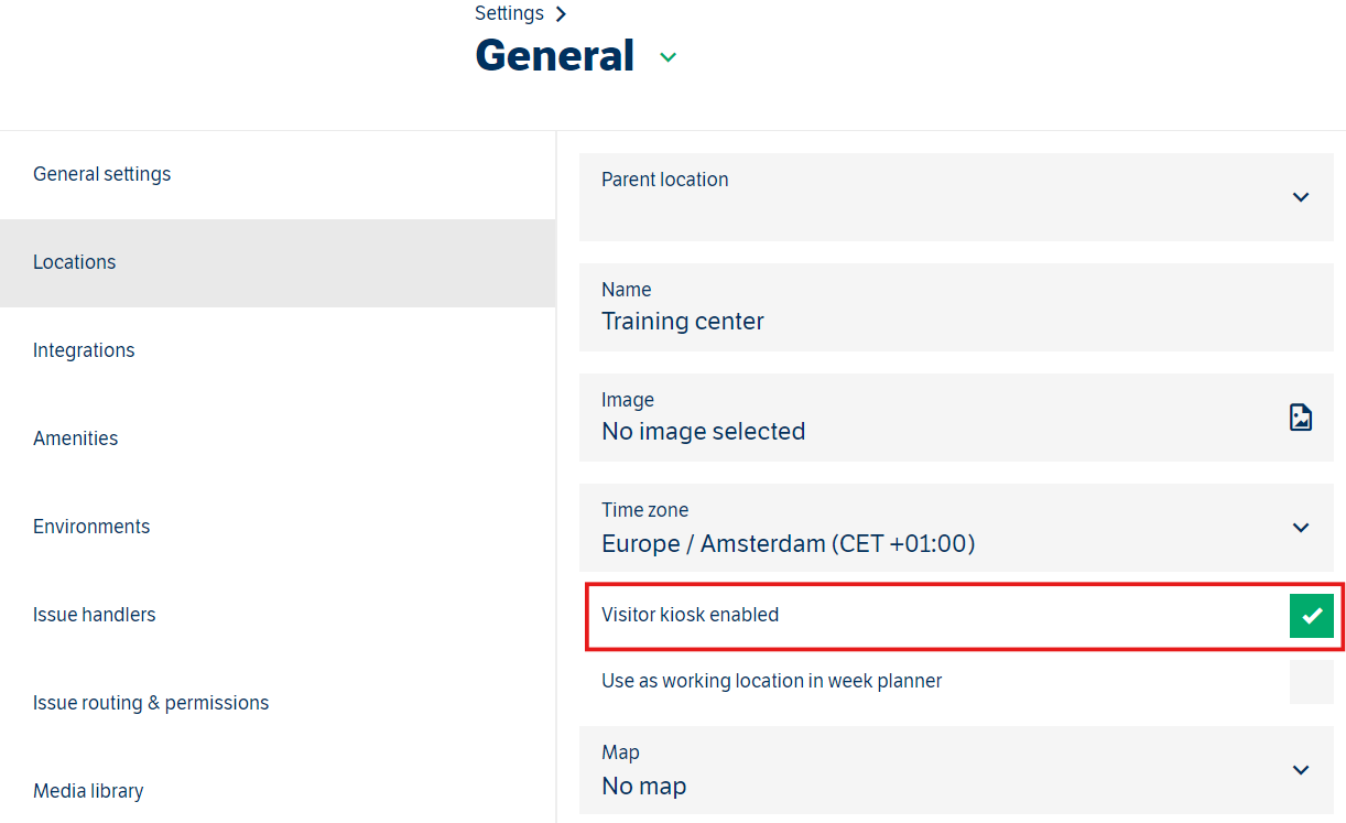 Hvis en lokasjon legges til i besøkskonfigurasjonen, må den også aktiveres i lokasjonsinnstillingene.