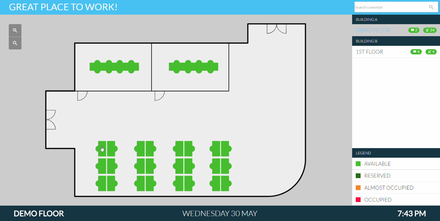 - Liveöversikt över beläggningsstatus för varje skrivbord eller rum.