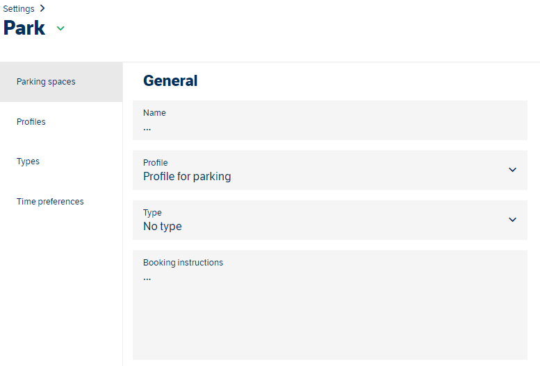 Med "Profile" kan du välja en inställningsprofil som definierar hur parkeringsplatsen ska fungera i systemet. Till exempel om no-show-detektering är aktiverad, om den är bokningsbar osv.