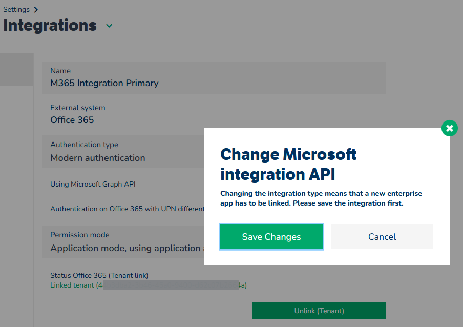 När du har markerat den här kryssrutan visas ett popup-meddelande där du ombeds spara ändringarna innan Microsoft Graph API-integrationen genomförs.