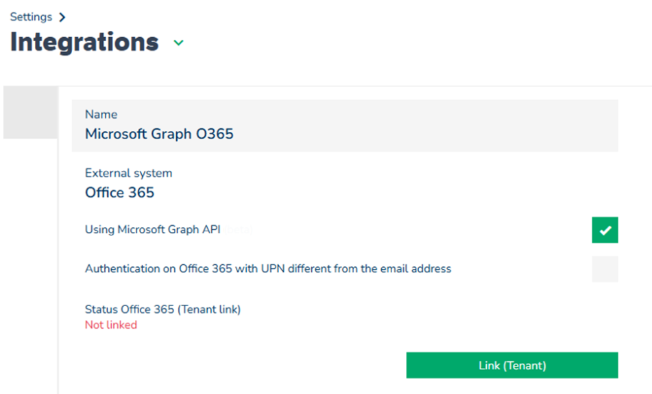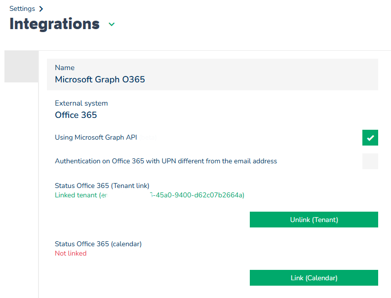 När du återvänder till O365-integrationen i GoBright kan GoBright se att SSO-tenantlänken är länkad, men det visas även en annan integration, ”Status Office 365 (kalender)”, som inte är länkad.