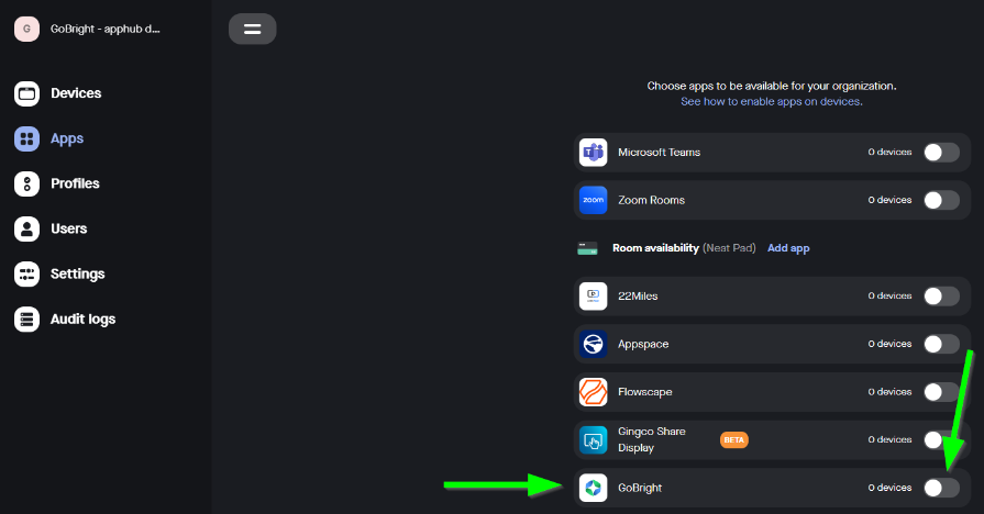 6. Välj Appar till vänster och under Rumstillgänglighet växla mellan GoBright strömbrytare