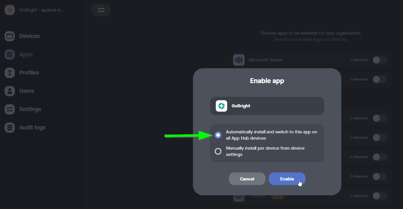7. Välj Automatiskt installera och växla till den här appen på alla App Hub-enheter och klicka på Aktivera