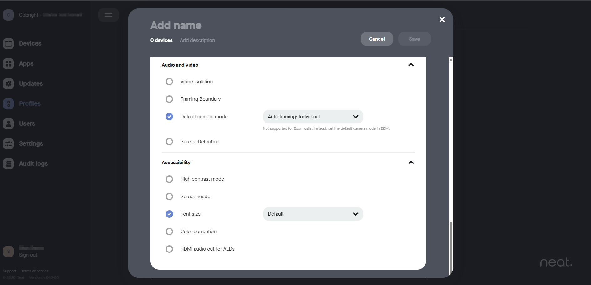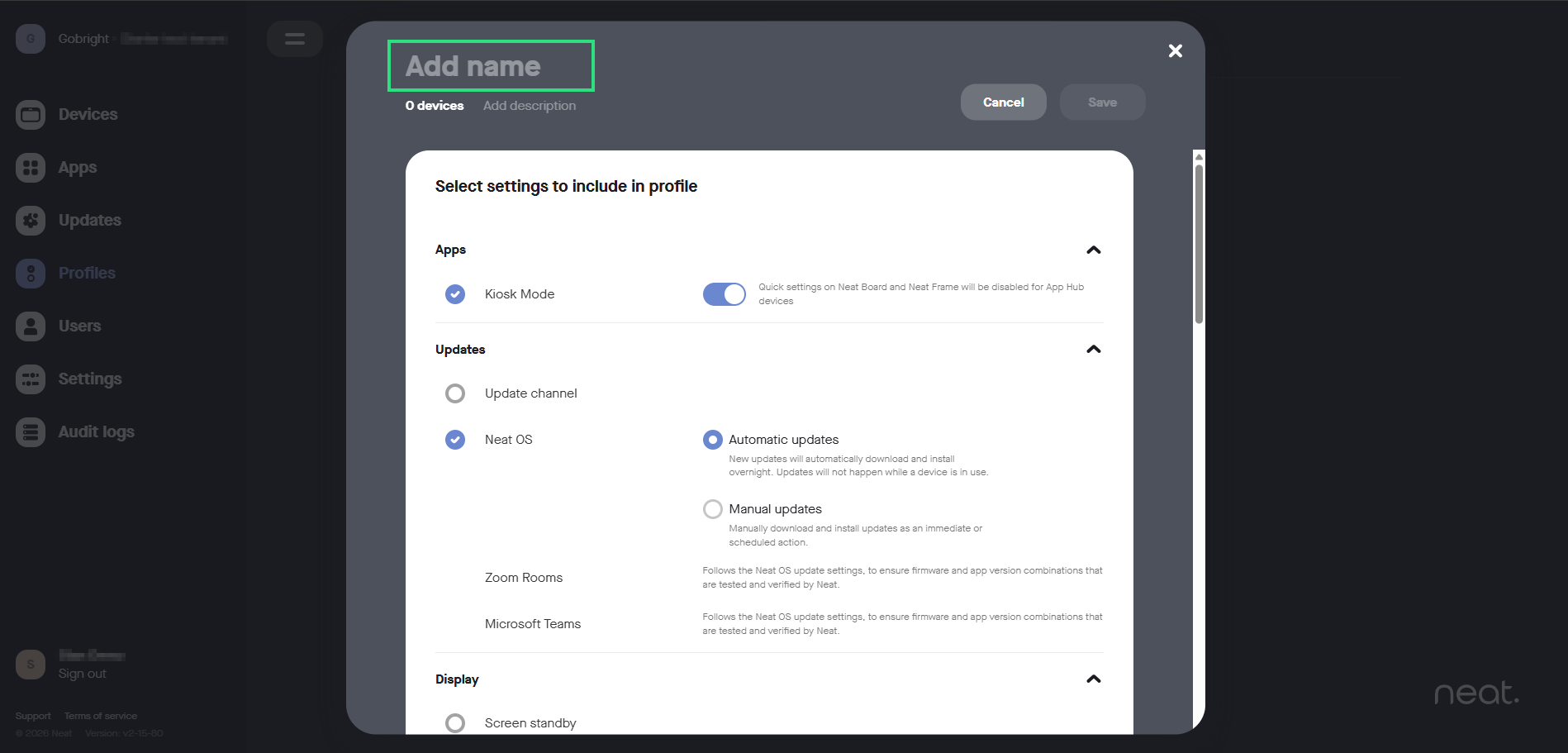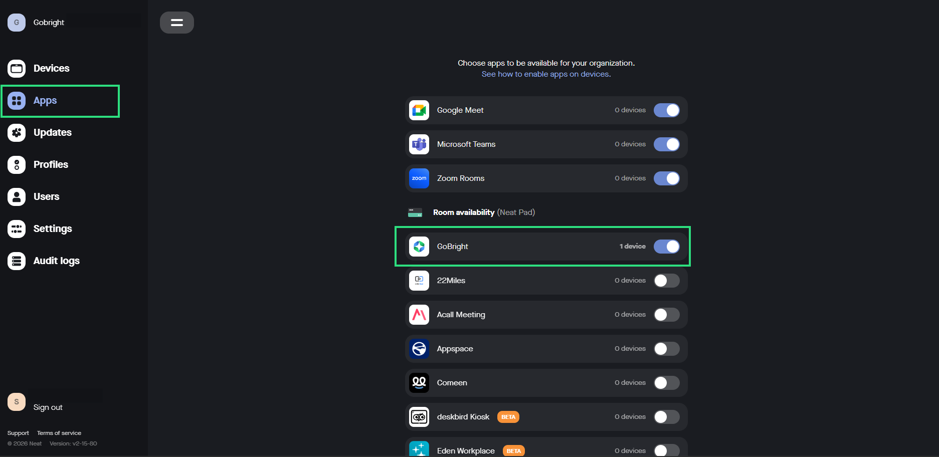 - Välj Appar till vänster och under ”Rumstillgänglighet (Neat Pad) och slå på strömbrytaren vid GoBright