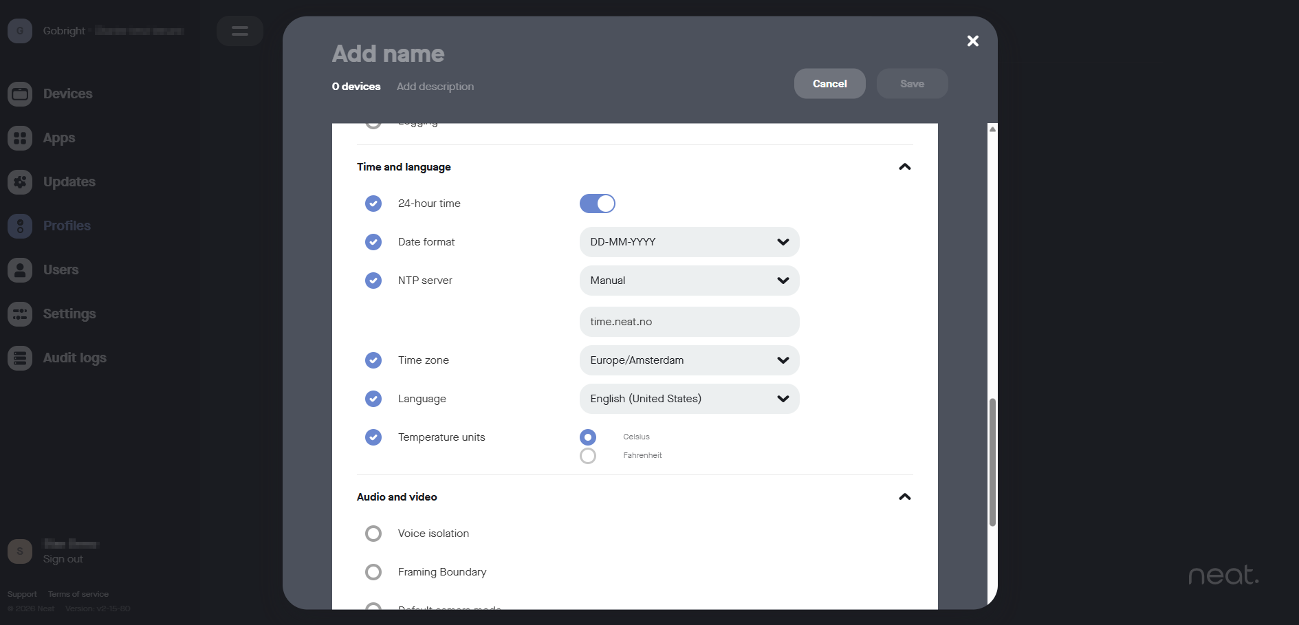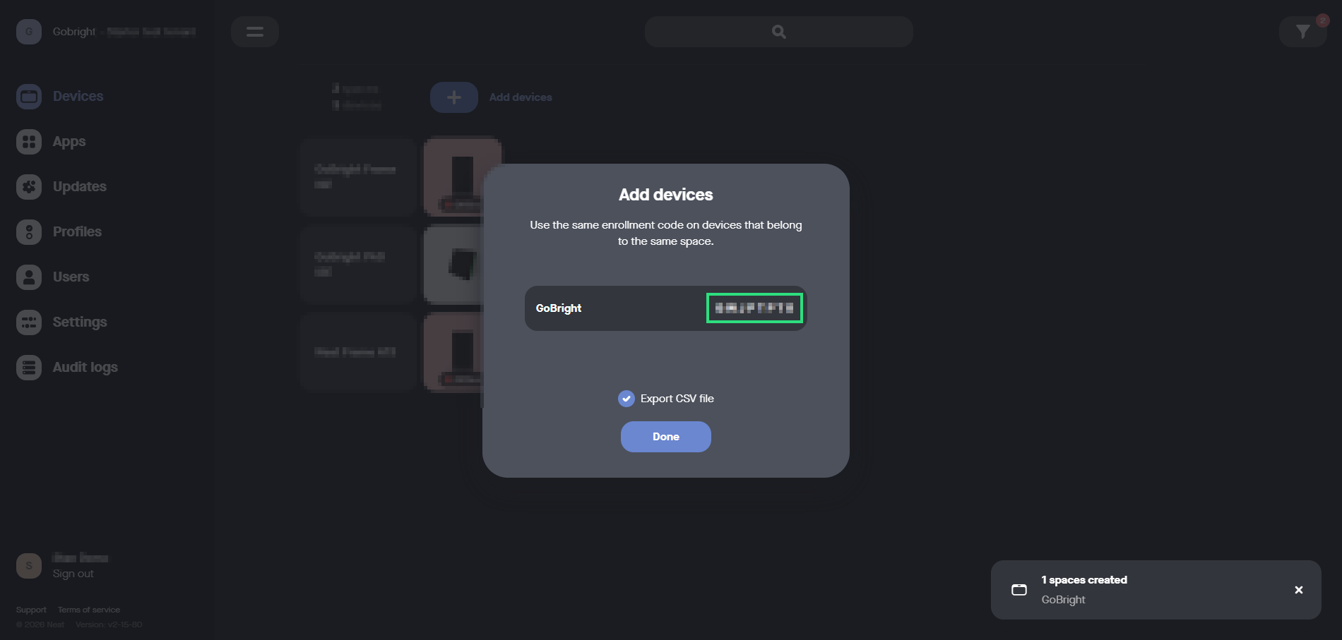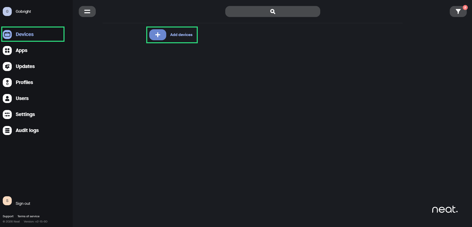 - En Neat-registreringskod krävs. Gå till https://pulse.neat.no på din dator och välj Apparater till vänster och tryck på Lägg till enheter