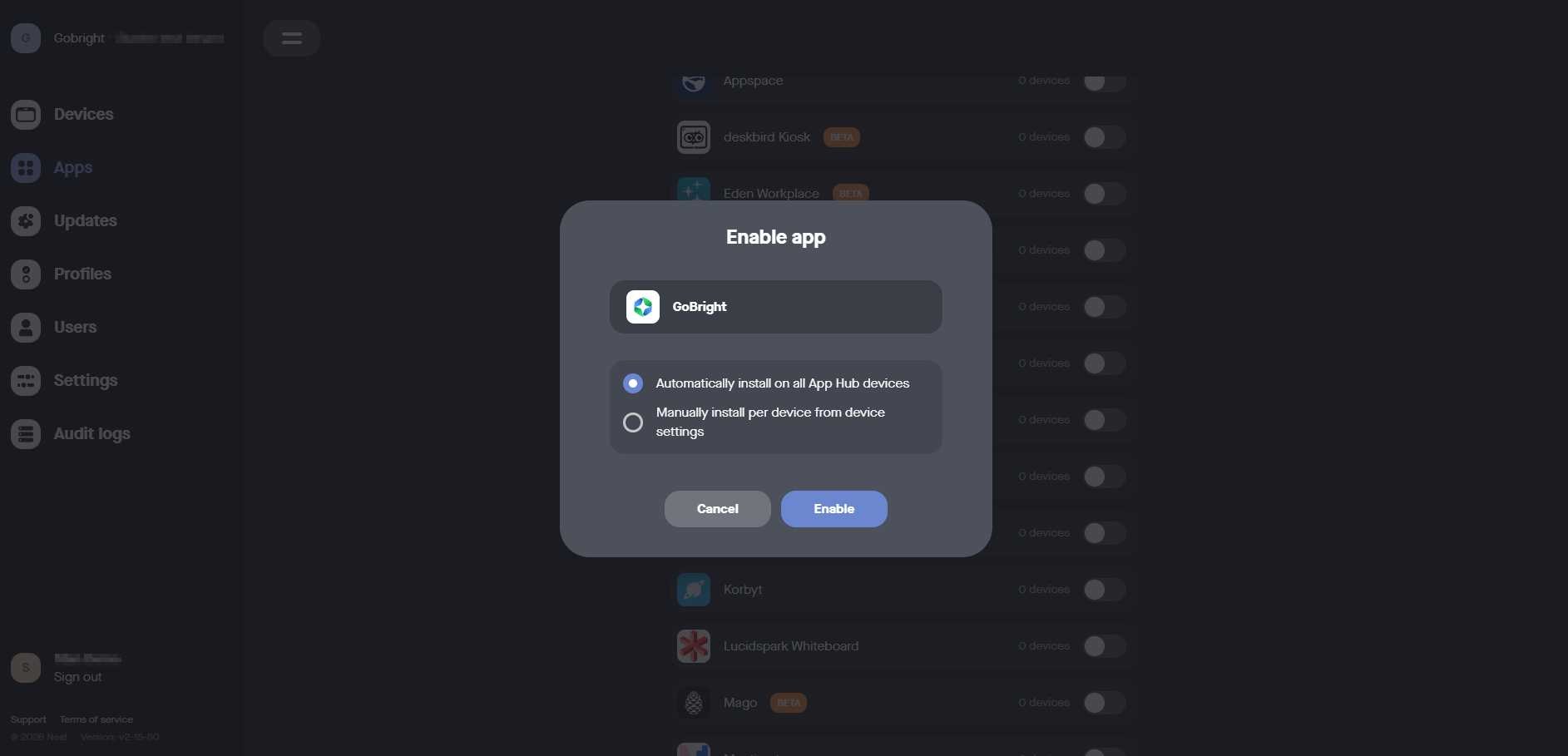 - Välj Installera automatiskt på alla App Hub-enheter och klicka Aktivera