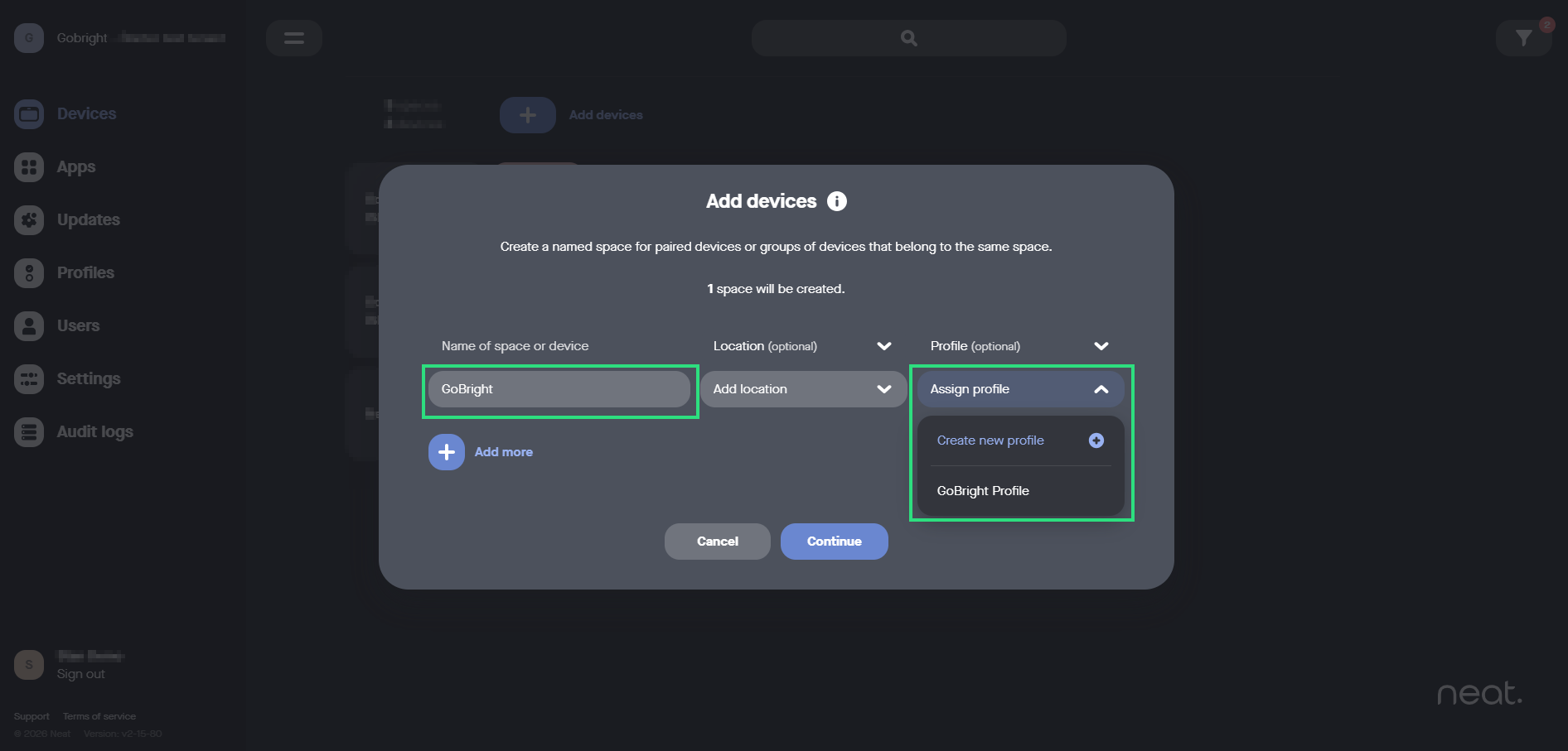 - Fyll i en Namn av utrymme eller enhet och välj en profil och tryck på Fortsätt