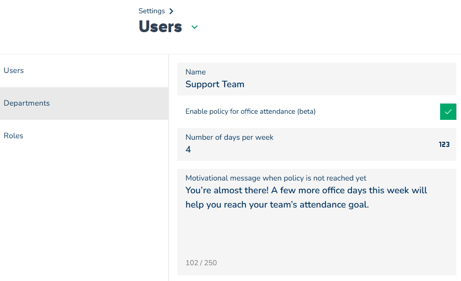 Ange hur många dagar per vecka du förväntar dig att dina teammedlemmar ska arbeta på kontoret. Du kan också lägga till ett motiverande meddelande för att uppmuntra dem att uppfylla det angivna närvaromålet.