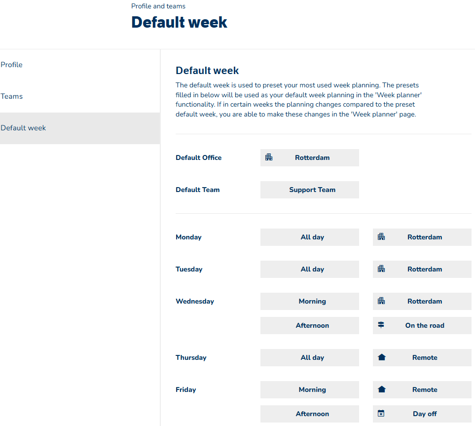 Här kan du definiera hur din typiska vecka är strukturerad genom att ange ditt allmänna arbetsmönster. Du kan till exempel ange att du arbetar på kontoret i Rotterdam på måndag och tisdag, reser på onsdag eftermiddag och tillbringar slutet av veckan med att arbeta hemifrån.