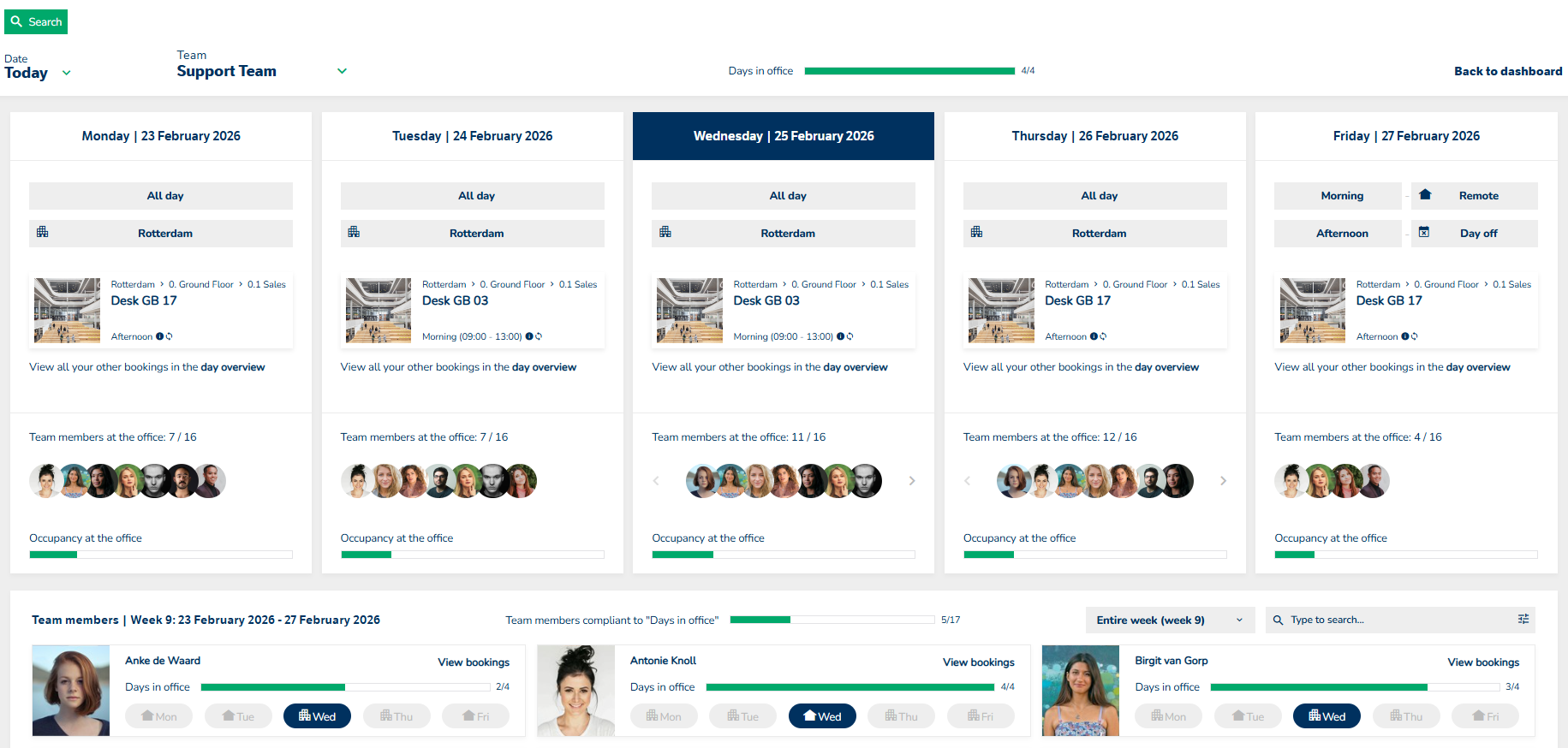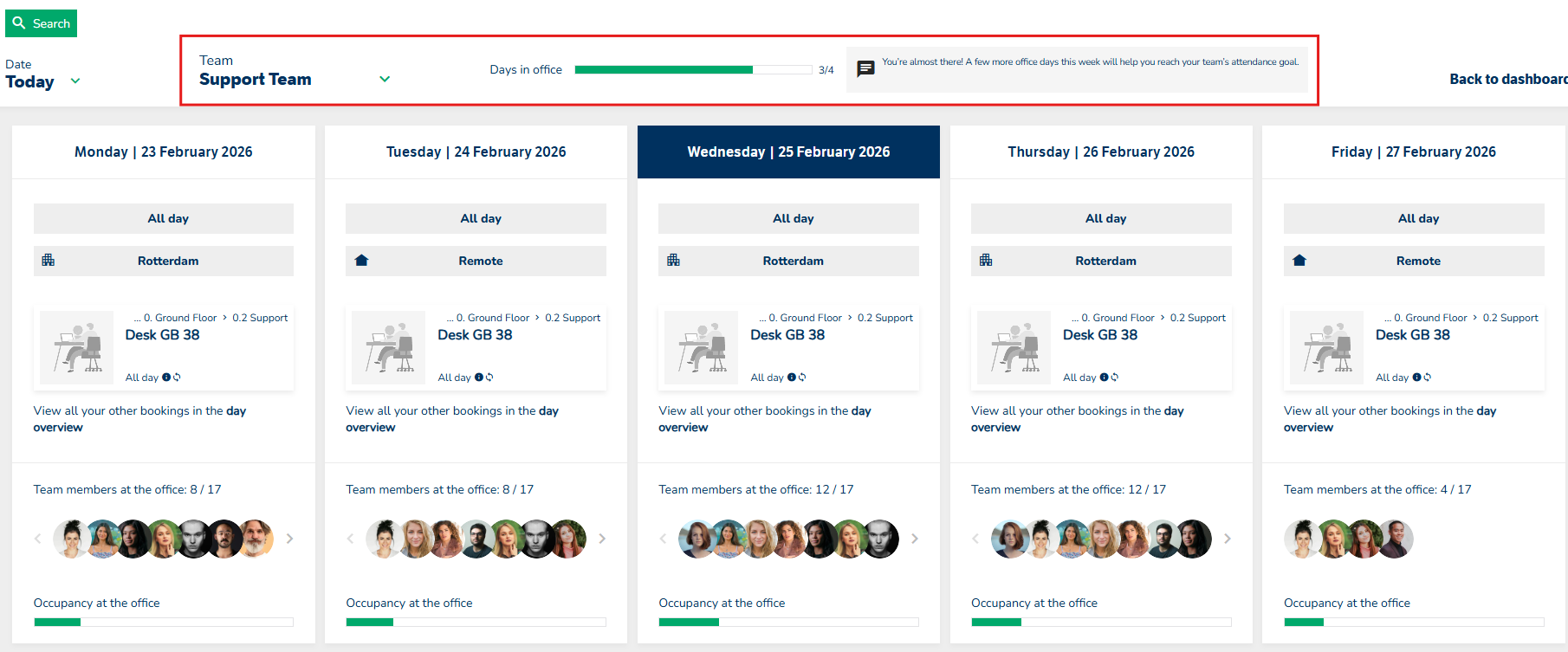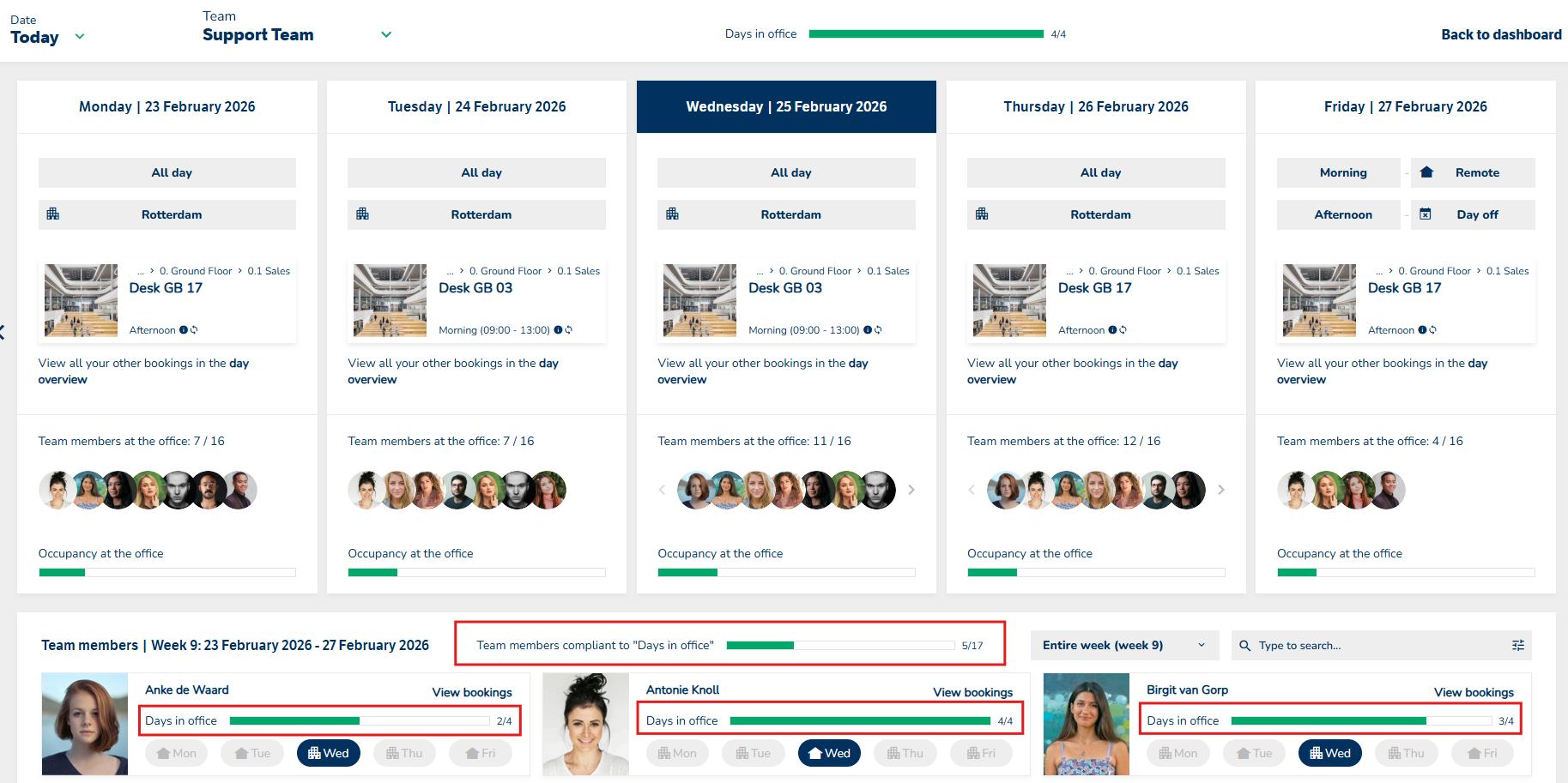 Systemet använder denna information för att fastställa planerade kontorsdagar och visar resultaten i fältet ”Teammedlemmar som uppfyller kravet på kontorsdagar” i veckoplaneraren. Veckoplaneraren hämtar och bearbetar automatiskt dessa data, vilket ger cheferna en tydlig och transparent översikt över teamets närvarokrav.