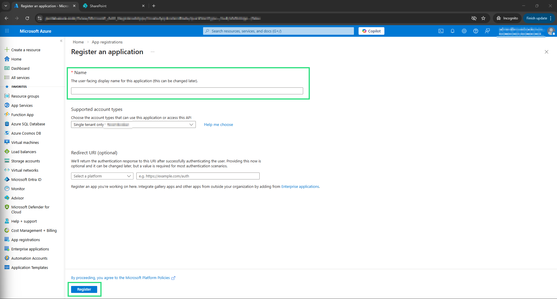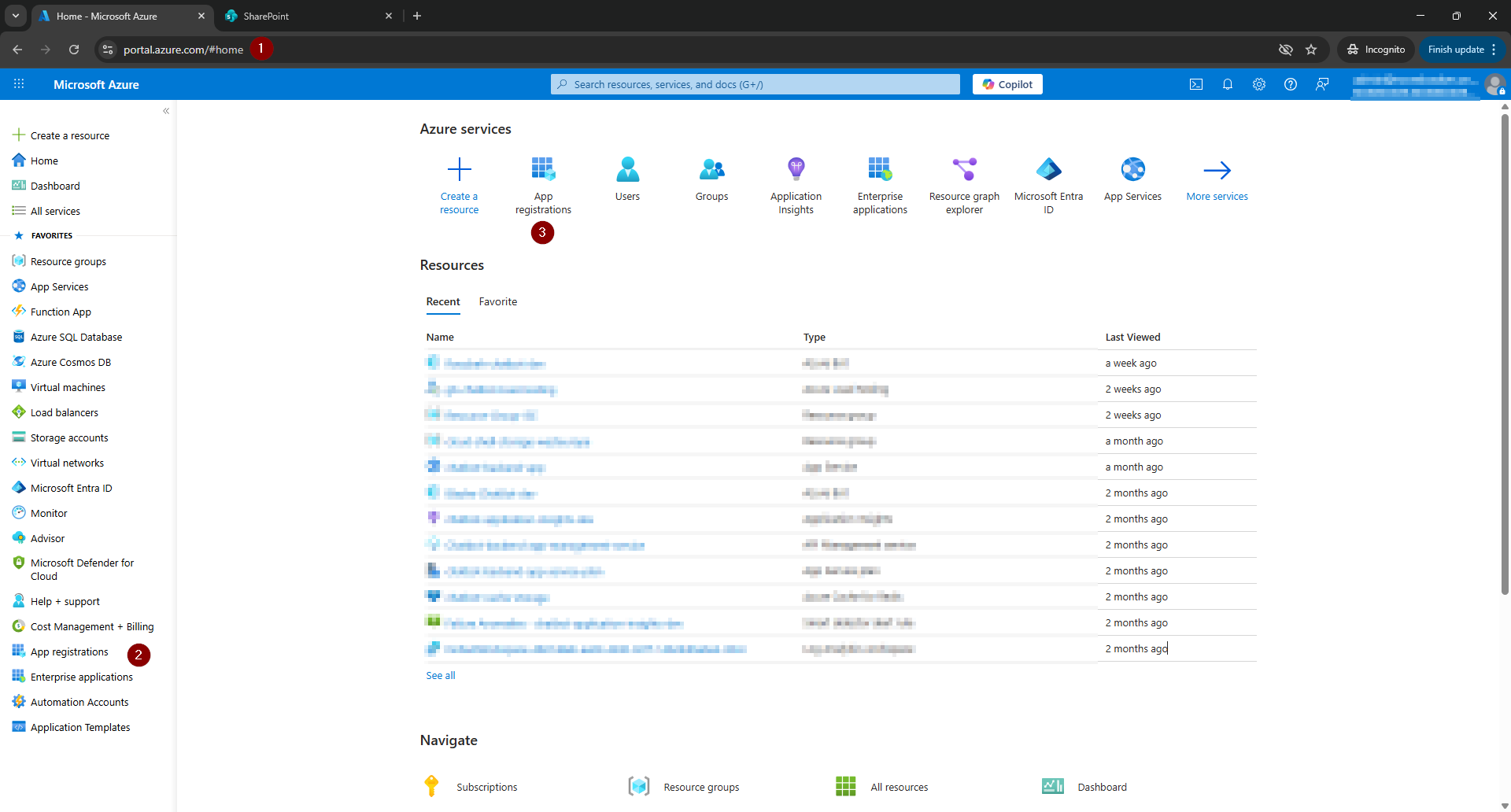 - Navigera till Azure-portalen → Azure Active Directory → Registreringar av appar