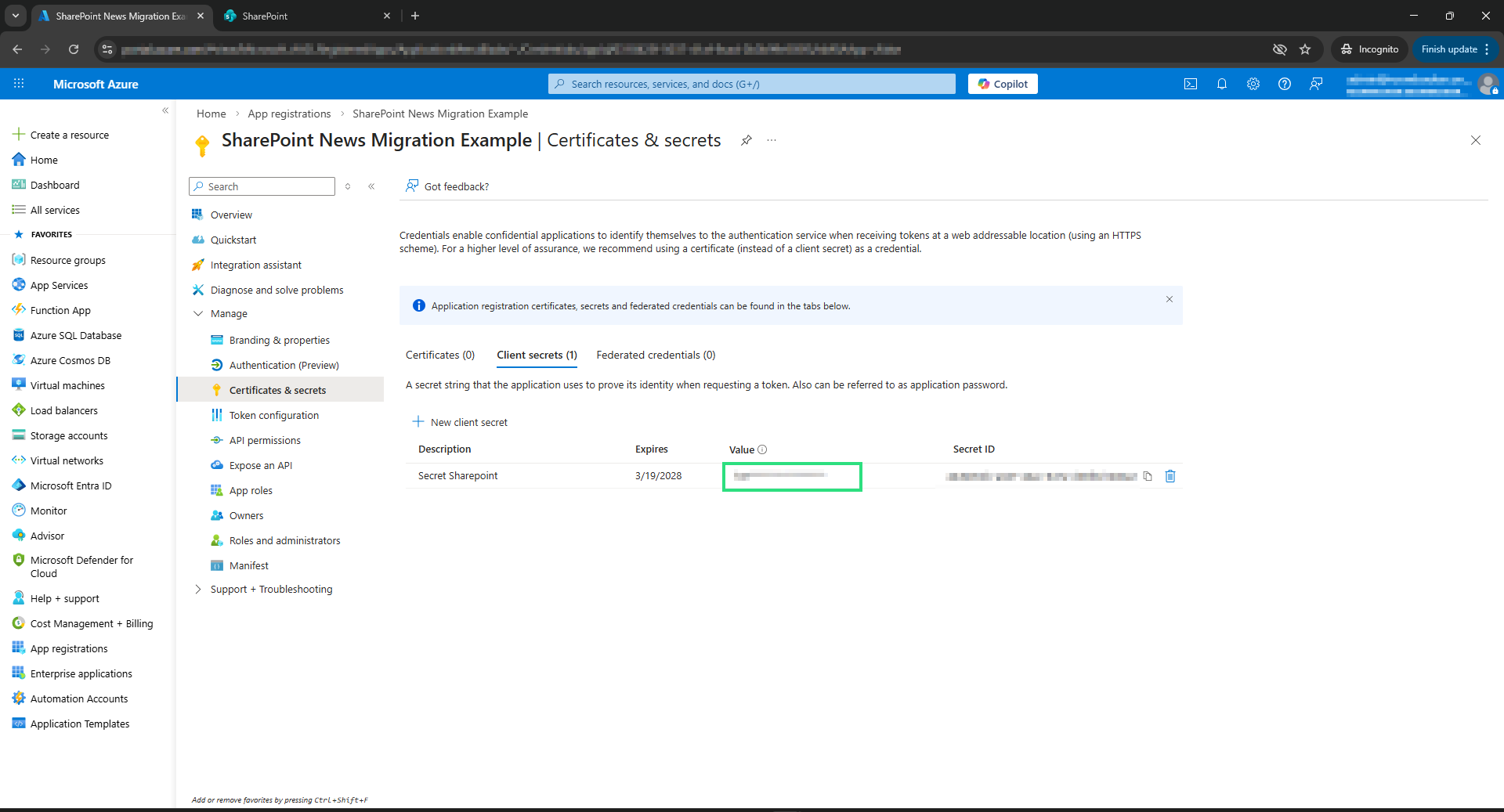 - Gå till ”Certifikat och hemligheter” → ”Klienthemligheter”
