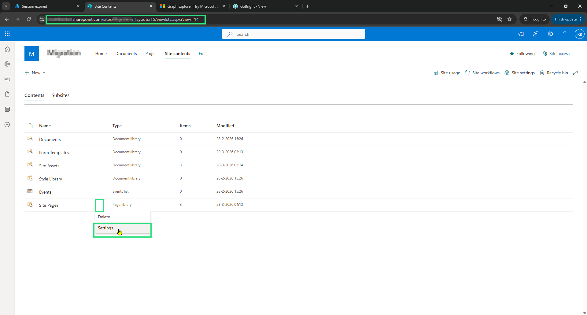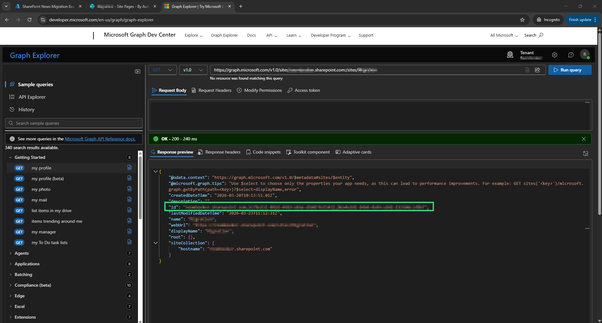 🔍 Felsökning av webbplatser. Valda: Om du stöter på behörighetsproblem kan du använda Graph Explorer för att testa de exakta API-anropen: